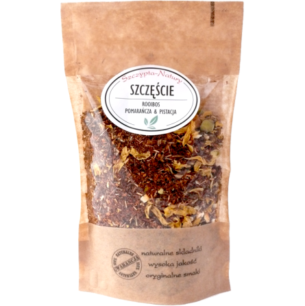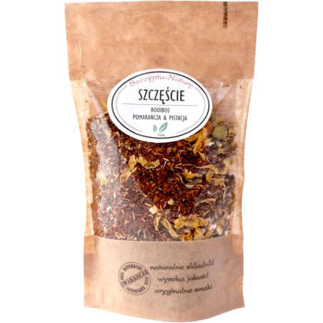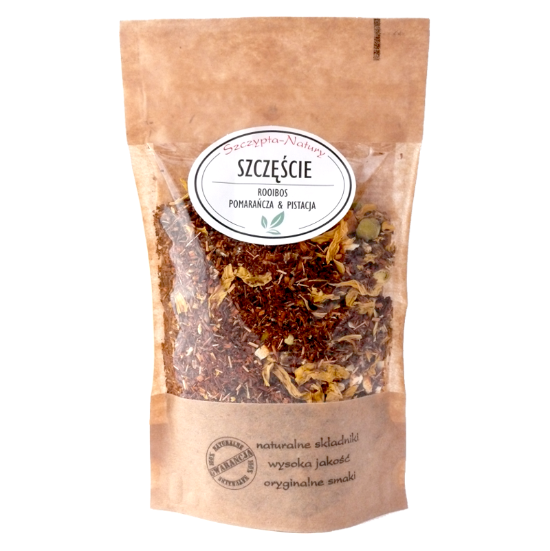 Nasza kompozycja czerwonego Rooibosa, owoców soczystej pomarańczy i kawałków pistacji, zachwyci Cię oryginalnym smakiem i intrygującym aromatem.