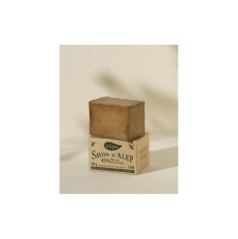 Mydło naturalne Alep (40% oleju laurowego) jest produktem całkowicie naturalnym. Formuła mydła opracowana wyłącznie na bazie surowców naturalnych nie zawiera w swojej oryginalnej formie sztucznych barwników, konserwantów, tensydów, perfum, ani innych substancji drażniących. Mydło Aleppo posiada autentyczne zalety lecznicze dzięki składnikom antyseptycznym (olej laurowy), a także właściwości zabliźniające i nawilżające (olej laurowy, oliwa z oliwek), które odnawiają film hydrolipidowy.