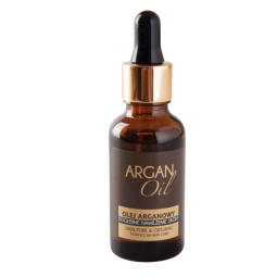 Olej arganowy zalecany jest w walce ze zmarszczkami, przedwczesnym starzeniem się skóry, doskonały dla dojrzałej cery. Pomaga zredukować powstałe już zmarszczki poprzez odbudowę warstwy hydrolipidowej skóry, a tym samym zachować młodzieńczy i zdrowy wygląd. Dzięki naturalnym antyoksydantom chroni organizm przed niekorzystnym działaniem wolnych rodników. Wzmacnia włosy i paznokcie oraz ma właściwości nawilżające - dogłębnie ujędrnia i napina skórę, REDUKUJE CELLULIT I ROZSTĘPY! Olej arganowy chroni przed działaniem szkodliwych dla cery czynników zewnętrznych, takich jak: słońce, wiatr, zimno. Posiada właściwości naprawcze, regenerujące i odżywcze
