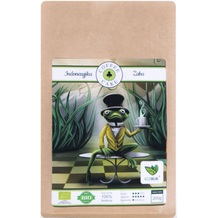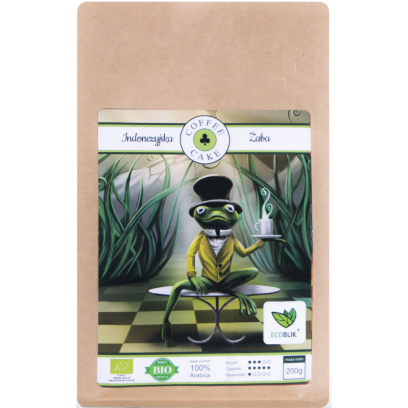 Kawa Indonezyjska Żaba uprawiana jest na niewielkich indonezyjskich plantacjach, gdzie krzewy kawy osłonięte są przed nadmiernym światłem przez wyższe partie roślin. Kawa ta charakteryzuje się pełną cielistością oraz niską kwasowością. Kawa Indonezyjska Żaba posiada smak gorzkiego kakao i rodzynek, a w unoszącym się aromacie wyczuwa się zapach drewna cedrowego i tytoniu.