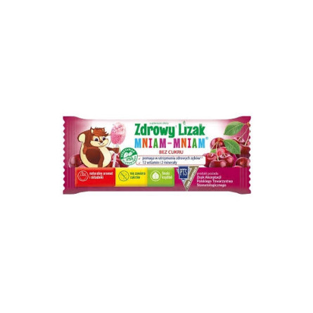 Skład: substancje słodzące: ksylitol, glikozydy stewiolowe; substancja wypełniająca: izomalt; regulatory kwasowości: węglany sodu, kwas cytrynowy; suszone wiśnie (2,2%); substancje przeciwzbrylające: sole magnezowe kwasów tłuszczowych, guma arabska; kwas L-askorbinowy (wit. C); amid kwasu nikotynowego (niacyna, wit. B3); octan DL-alfa-tokoferylu (wit. E); glukonian cynku (cynk); D-pantotenian wapnia (kwas pantotenowy, wit. B5); monoazotan tiaminy (wit. B1); ryboflawina (wit. B2); chlorowodorek pirydoksyny (wit. B6); octan retinylu wit. A); kwas pteroilomonoglutaminowy (kwas foliowy, wit. B9); D-biotyna (biotyna, wit. B7); selenian (VI) sodu (selen); cholekalcyferol (wit. D); cyjanokobalamina (wit. B12); naturalny aromat wiśniowy; barwnik: antocyjany.