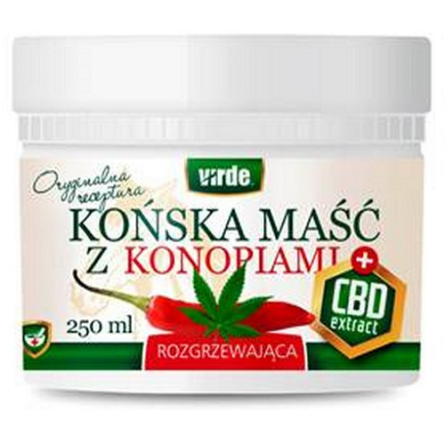 Maść przeznaczona jest do masażu skóry w okolicach mięśni, stawów i ścięgien.Wyprodukowanazostała z najwyższej jakości składników zgodnie z tradycyjną recepturą maści końskiej i wzbogacona dodatkowoekstraktem CBD (kannabidiolem naturalnie występującym w roślinach konopi).Olej konopny zawarty w maści ma właściwości regeneracyjne, odżywcze iantyoksydacyjne. Jest bogaty w witaminy, fosfolipidy, fitosterole i minerały.Działanie oleju potęgują ekstrakty ziołowe z nagietka, żywokostu, kasztanowca, arniki, lawendy. Kamfora i kapsaicyna sprawiają, że preparat ma działanie rozgrzewające. Efekt rozgrzania jest naturalnym objawem wzrostu ukrwienia. CBD łagodzi napięcie skóry, odżywia, przyczynia się do jej regeneracji i zmiękczenia.Działanie:Przynosi ulgę i rozluźnienie, a tym samym przyspiesza rekonwalescencję po nadmiernym wysiłku lub przemęczeniu.
