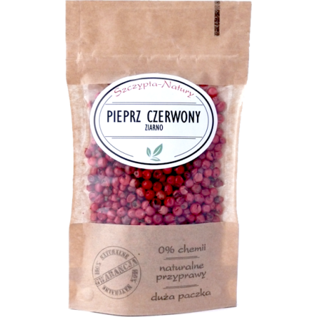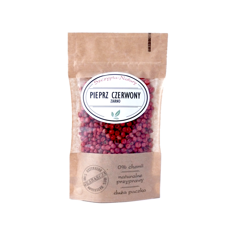 Pieprz czerwony nazywany jest również peruwiańskim. Nazwa tych jadalnych, czerwonych owoców wywodzi się od uderzającego podobieństwa do złudzenia, przypominający typowy pieprz czarny, choć nawet nie jest spokrewniony z roślinami rzędu pieprzowatych. Charakteryzuje się słodkawym, początkowo łagodnym później odrobinę pikantnym smakiem.