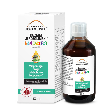BALSAM JEROZOLIMSKI® DLA DZIECI zawiera starannie dobraną kompozycję ziół stworzoną według zakonnej receptury Zakonu Bonifratrów. Składniki zawarte w preparacie wspierają właściwe funkcjonowanie układu oddechowego** i odpornościowego*.