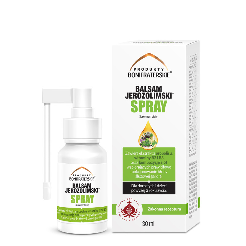 BALSAM JEROZOLIMSKI® SPRAY z ekstraktem z propolisu został stworzony w trosce o prawidłowe funkcjonowanie układu oddechowego w tym błony śluzowej gardła*.