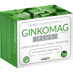 Ginkomag Plus zawiera w swoim składzie unikalną kombinację witamin oraz wysoko skoncentrowanego ekstraktu z miłorzębu japońskiego (Ginkgo biloba), który przyczynia się do utrzymania prawidłowego funkcjonowania mózgu u osób starszych. Dodatkowo Ginkomag Plus zawiera w swoim składzie lecytynę sojową i magnez.