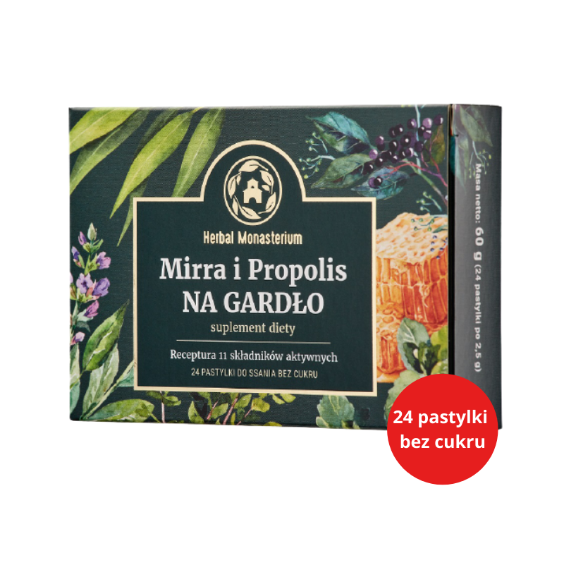 Mirra i propolis na gardło to pastylki do ssania zawierające naturalne składniki o potwierdzonym naukowo działaniu. Nie zawiera cukru, konserwantów i barwników. W swoim składzie zawiera standaryzowany ekstrakt z propolisu, ekstrakt z balsamowca mirry oraz najwyższej jakości składniki aktywne. Tworzy powłokę ochronną na błonie śluzowej gardła, krtani, i strun głosowych, łagodząc podrażnienia. Wspomaga funkcjonowanie układu oddechowego. Poprawia drożność nosa oraz ułatwia oddychanie. Szerokie spektrum składników aktywnych. Wzmacnia układ odpornościowy organizmu.