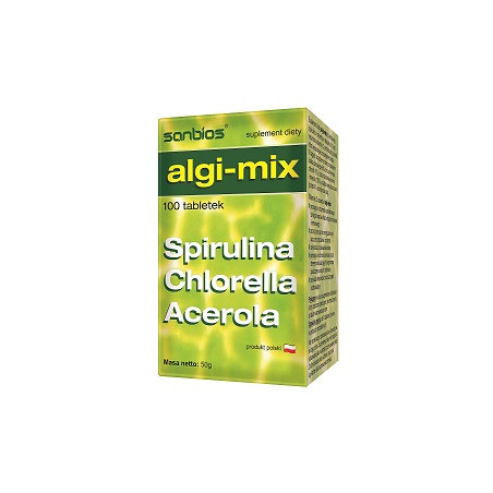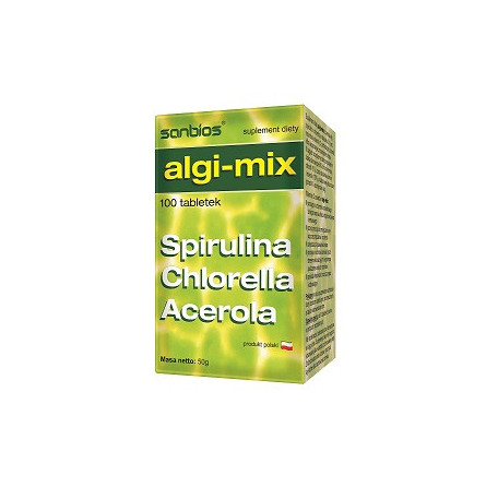 Suplement diety algi-mix to zestaw optymalnie dobranych alg (spirulina, chlorella) w stosunku 2:1 oraz naturalnej witaminy C pochodzącej z aceroli, która wspomaga biodostępność wszelkich odżywczych związków zawartych w preparacie.