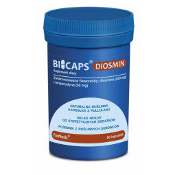 Suplement diety BICAPS® DIOSMIN zawiera 450 mg diosminy i 50 mg hesperydyny w 2 kapsułkach bez żadnych dodatków. Produkt odpowiedni dla wegetarian i wegan. Diosmina i hesperydyna wspierają naczynia włosowate, zmniejszają ich przepuszczalność, działają przeciwobrzękowo, niwelują skurcze nóg. Są stosowana w zwalczaniu żylaków i hemoroidów.