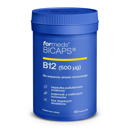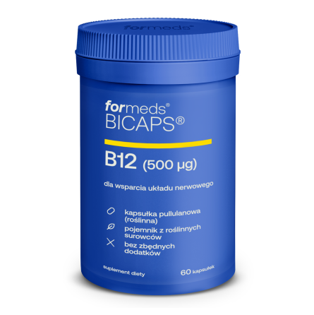 BICAPS B12 zawiera 500 μg witaminy B12 (metylokobalamina) oraz 290 mg inuliny w 1 kapsułce bez żadnych dodatków. Witamina B12 została otrzymana w drodze fermentacji. Produkt odpowiedni dla wegetarian i wegan.