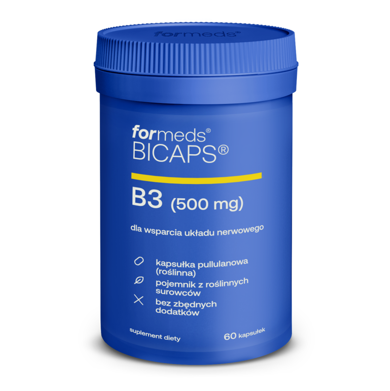 500 mg niacyny w formie kwasu nikotynowego i amidu kwasu nikotynowego - bez "efektu flush". Efekt "flush" to krótkotrwałe zaczerwienienie skóry i uczucie gorąca, które może wystąpić po spożyciu wysokiej dawki witaminy B3 (niacyny). Jest to związane z rozszerzeniem naczyń krwionośnych spowodowanym działaniem kwasu nikotynowego na organizm. Efekt "flush" jest zwykle krótkotrwały i niegroźny dla zdrowia, ale może być uciążliwy dla niektórych osób.
