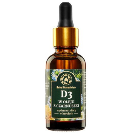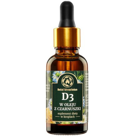 2000 IU witaminy D3 z lanoliny w 1 kropli oleju z czarnuszki. Odpowiednia podaż witaminy D3 w organizmie wzmacnia układ odpornościowy, reguluje przebieg reakcji zapalnej oraz obniża ryzyko chorób zakaźnych. Reguluje właściwą gospodarkę wapniowo-fosforanową, co wpływa na wzmocnienie układu kostnego, mięśniowego oraz uzębienia. Niedobory witaminy D są bardzo rozpowszechnione i dotyczą 50–80% populacji, stanowiąc poważny problem epidemiologiczny. Dlatego regularna suplementacja jest najlepszym sposobem na dostarczenie do organizmu prawidłowej ilości witaminy D.