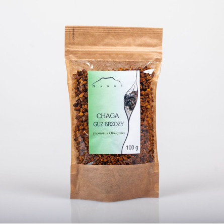 Chaga (Inonotus obliquus) – czyli błyskoporek podkorowy (huba brzozowa, guz brzozy), jest to grzyb o czarnej zewnętrznej barwie i rdzawym miąższu wewnątrz, będący charakterystyczną naroślą, występującą na pniach obumierających drzew, najczęściej brzóz. Występuje na chłodniejszych obszarach półkuli północnej. Inonotus obliquus wykazuje wiele korzystnych właściwości, dzięki zawartości takich związków jak polisacharydy, beta-glukany, fitosterole, betulina i kwas betulinowy (triterpeny), przeciwutleniacze (chaga posiada najwyższy wynik miary działania antyoksydacyjnego, według skali ORAC).